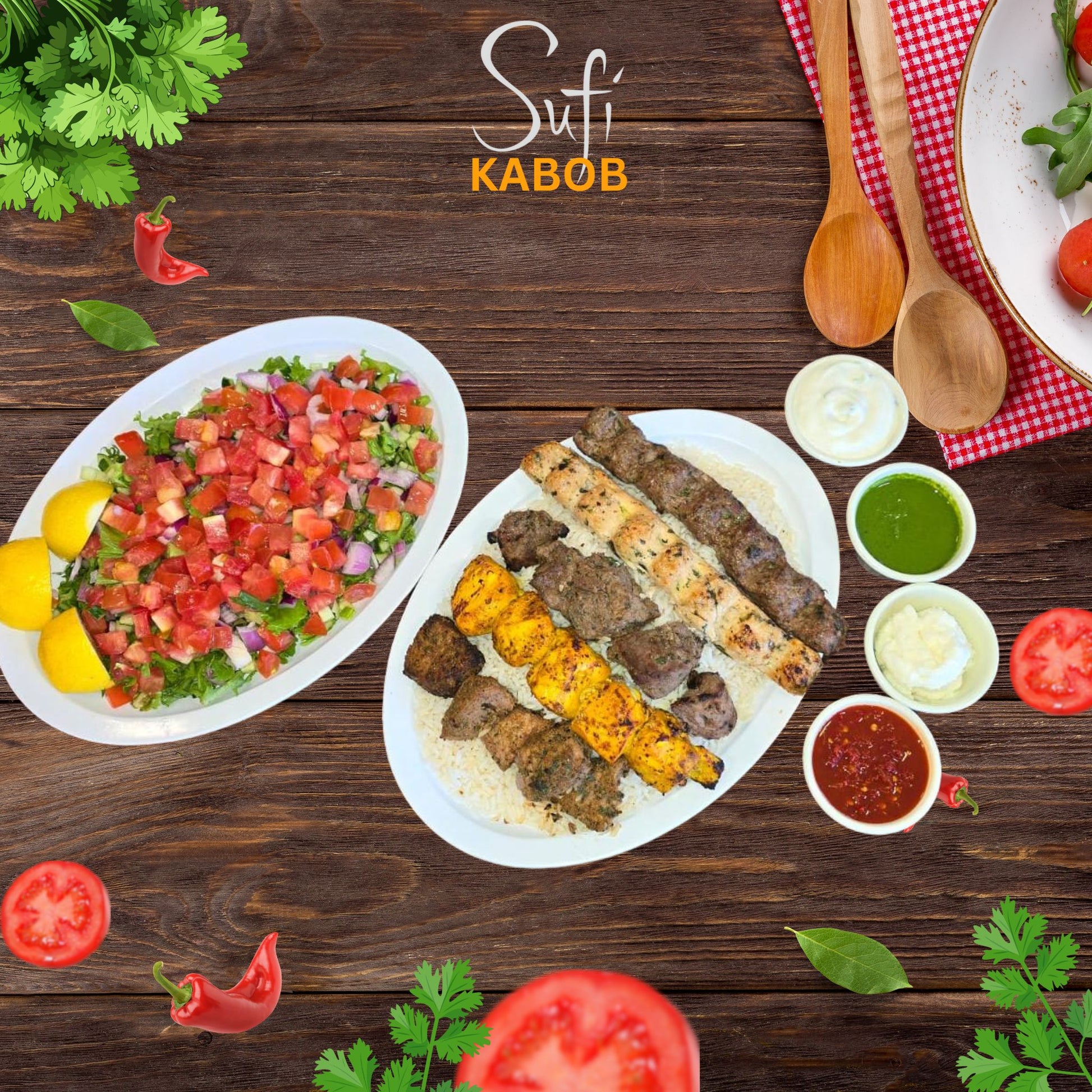 +1 (361) 356-6715A combo of 5 different skewers (lamb steak, chicken steak, chicken kafta, beefsteak, and beef kafta). Served with rice, fresh salad, and tzatziki sauce.