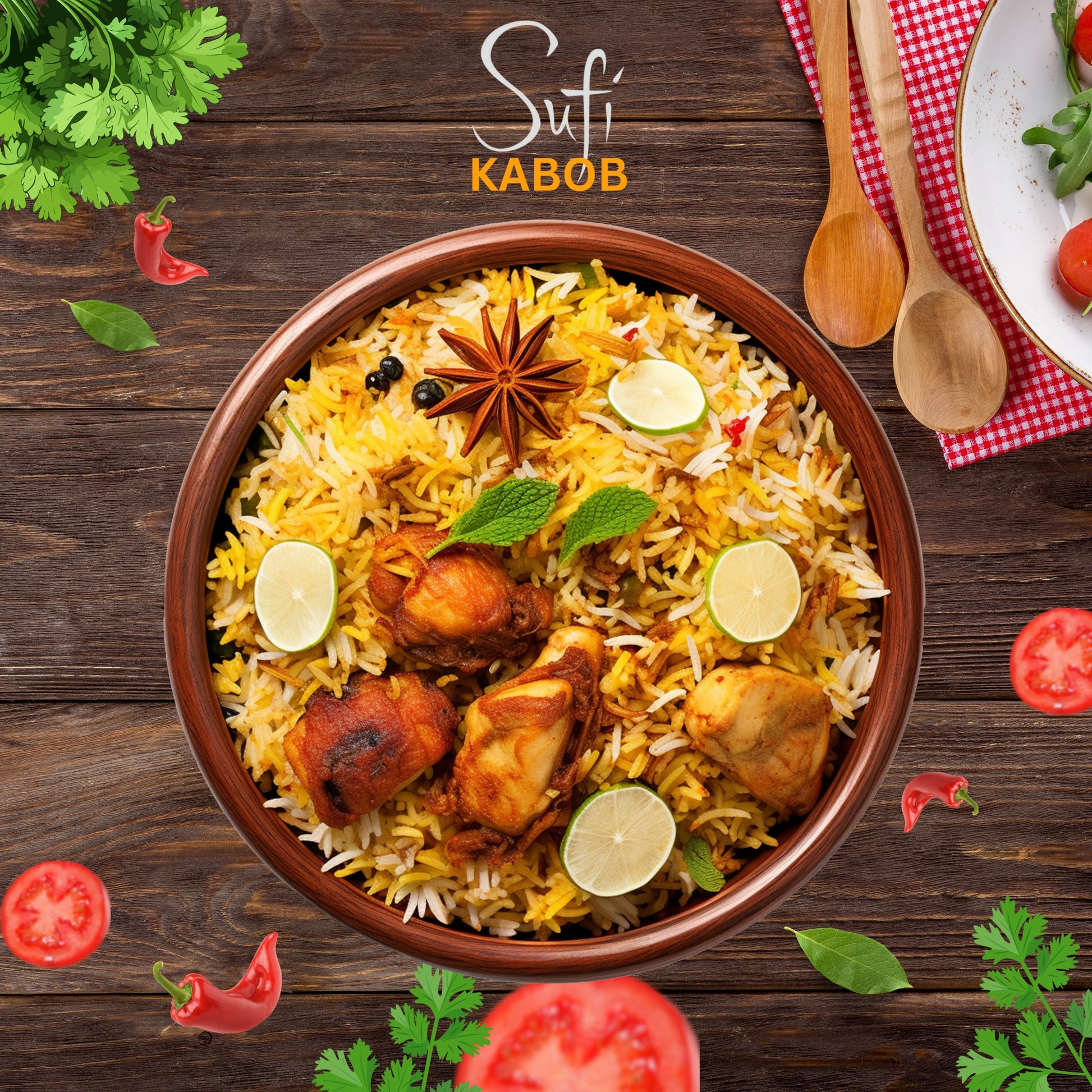 +1 (361) 356-6715Sufi Special Chicken Biryani features fragrant basmati rice paired with a tender chicken leg or thigh, served with a crisp cucumber and yogurt salad.